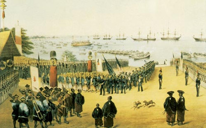 1853年(嘉永六年)七月,美国东印度舰队司令马修·培里(Matthew·Calbraith·Perry,1794~1858)将军,率领四艘军舰开到江户湾口,以武力威胁幕府开国。舰队中的黑色近代铁甲军舰,为日本人生平第一次见到。培里赠给幕府显示工业文明的火车机车模型和电报机,而幕府却只能用力士搬运回赠的大米来展示实力。培里来航令日本人震惊,深切感受到日本与外国的巨大差距。日本人称这次事件为“黑船来航”。由于这四艘军舰合共有六十三门大炮,而当时日本在江户湾的海防炮射程及火力可与这四艘军舰相比的大约只有二十门,在不开国就开火的威吓下,幕府不敢拒绝开国的要求,但又恐怕接受培里带来的国书后,会受到全国的抨击,于是当时幕府的首席老中阿部正弘藉口要得到天皇的批准方可接受条约,并约定培里下一年春天给予答复。
