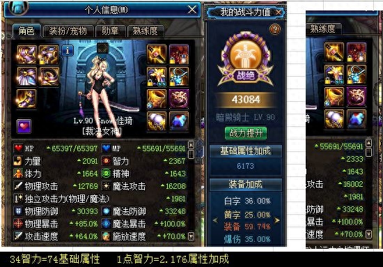 40智力=1684 30魔攻=1668战力 6暴击=3252 14暗属性=4239