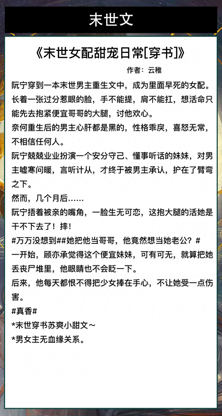 伪骨科!男女主没有血缘关系!女主穿书知道末世来临!求哥哥大霸总庇护!和哥哥说了末世要来!一起去买物资,买武器!男女主智商在线!
