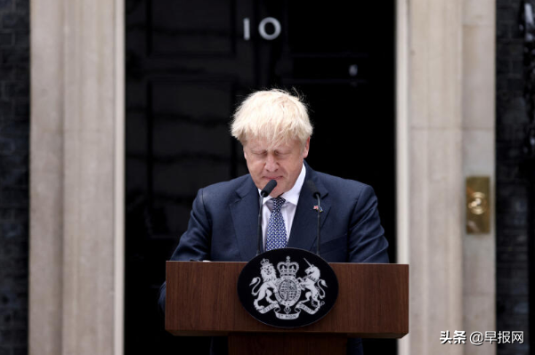 英国首相约翰逊7月7日在唐宁街10号门前发表讲话,宣布辞任。(路透社)