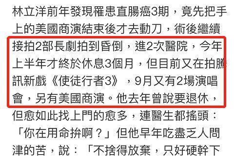 一波未平一波又起,林立洋在今年年发掘患有大肠癌,但他却比及商演收场以后才去医治,手术后又因接拍两部电视剧昏迷,进两次病院,直到2019上半年才偶然间好好苏息。