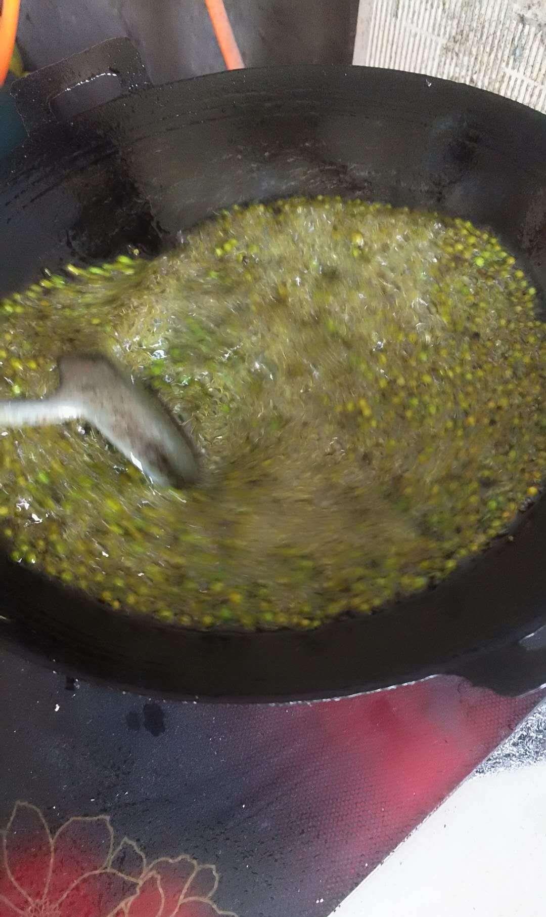 把洗干净滴干水的木姜子,到进烧好的油里,炸至木姜子成黄色。