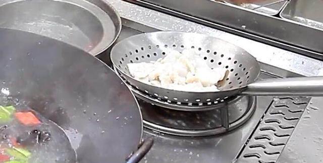 第十步在锅里面烧上水,等到水开之后放上鱼片,焯水二十秒,倒出鱼片沥干水分备用!