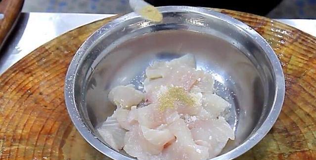 第四步在盆里面加上一勺子食盐,一勺子鸡粉,一勺子胡椒粉,然后用手给它抓匀,给鱼肉入味,加上适量的清水,让鱼片吸收水分!