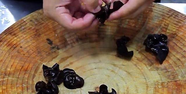 第七步提前把木耳泡发好,然后撕成小片,然后放在盆里面备用!