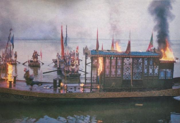 另一边,黄炳带着大队官兵乘船来到石碣湖,阮家三兄弟却早有准备,将官船引到了附近的芦苇荡。阮氏兄弟在自己的渔船上堆满稻草,冲向了官兵的船只,接着放火烧船。