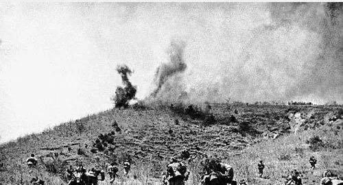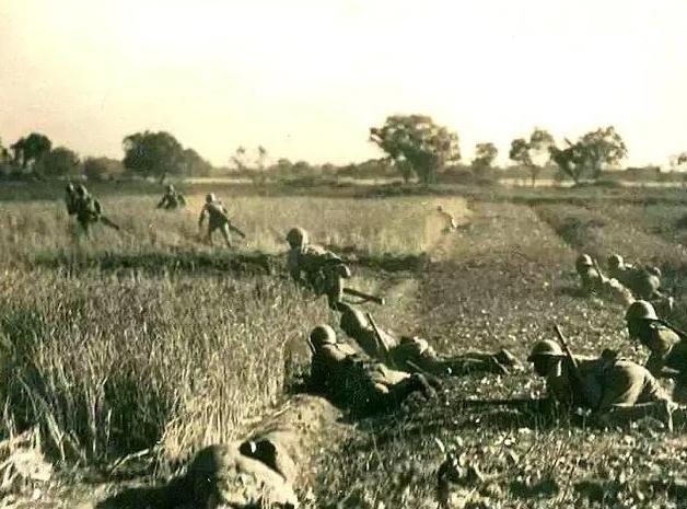 这个看上去是日军,也是成散开队形,在影视剧里边,步兵都是密集队形,但是如果是有关于战争的纪录片里边,那么步兵队形都是散开的,一个镜头里边看不见几个人,但是电视剧里边要是这么拍就太难看了。