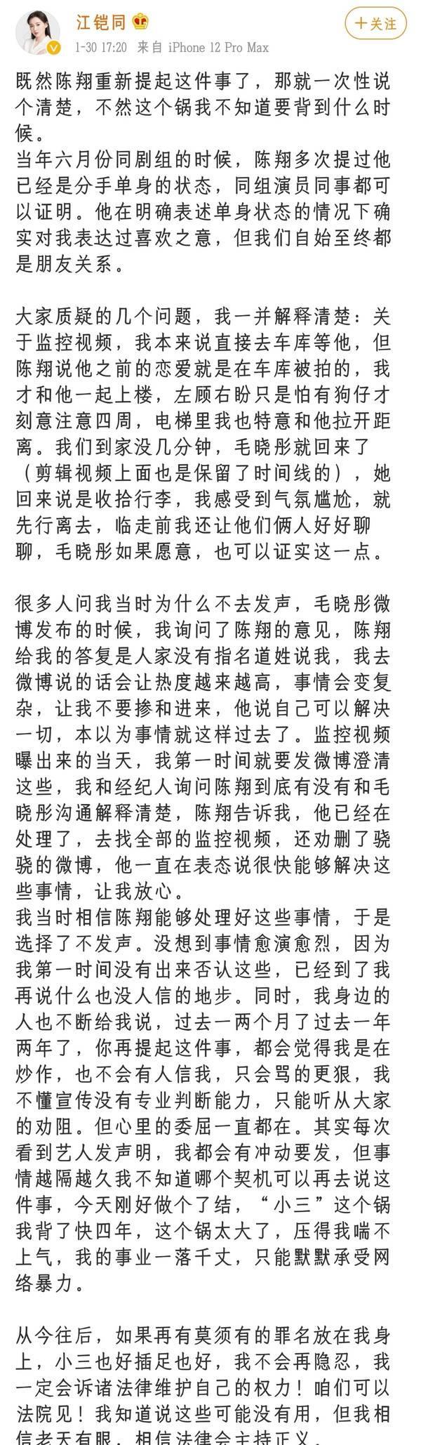 而在最近,这件事情在被陈翔正式回应之后,江铠同也发布长文表示,并且完全地扭转了自己作为小三的这一个局面,在文章里面也表示,当时的陈翔是以单身者的名义来追求他。而两个人这样不一样的口供,也让大家对于这一件事情有了更大的看法,不知道谁在这一件事情里面撒谎呢?陈翔表示自己并没有出轨,江铠同而江铠同表示,陈翔是以单身者的名义来追求她的,这样的口供也让大家认为,陈翔这一个人,这一次是不是又有什么新花样想要耍呢?而陈翔在这一篇文章里面也表示,关于在电梯里面多视频也是有人打着丢了东西的名号录下了这一个视频,并且在网络上面发布。