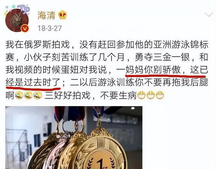 后来参加亚洲游泳锦标赛,更是拿到了三金一银的骄傲成绩,让身为母亲的海清十分自豪,忍不住晒出金牌,并发文夸赞儿子。