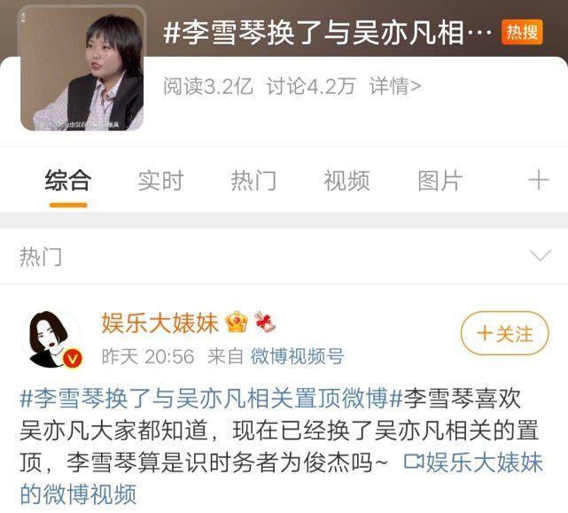 先说说头号迷妹吧!娱乐圈里公开表示喜欢吴亦凡的女艺人,一个是李雪琴,一个是沈梦辰。可就在7月18日,都美竹发出最后的宣战后,李雪琴急忙取消了置顶吴亦凡的那个小视频,取关脱粉。