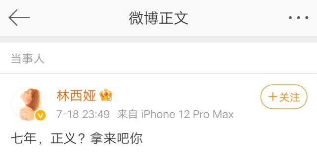 7月18日晚,演员林西娅发博:“七年,正义?拿来吧你”,与吴亦凡正面开杠。很多人不认识林西娅,她是一个名气不大的小演员,是吴亦凡最早在exo时期的绯闻女友。