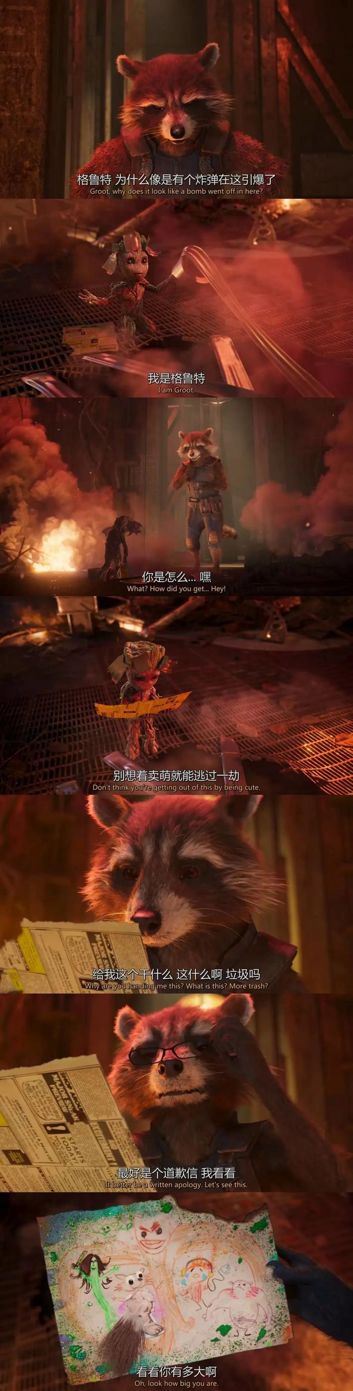 看到格鲁特宝宝递过来的画之后,火箭浣熊感到非常欣慰并表示自己就是没法生格鲁特宝宝的气。