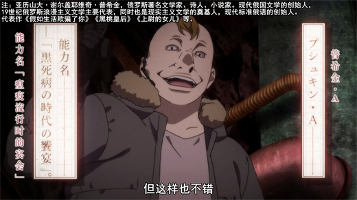 俄国文豪普希金的形象出人意料,是个胖大叔,之前还伪装成小喽啰的样子,在最后时刻用手枪击中了芥川,给他也下了共噬病毒,可以说这次的作战只能破釜沉舟了。