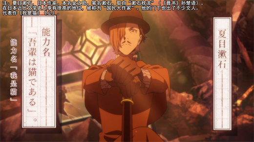 关于夏目漱石的异能“我是猫”,情报并不多,目前已知他可以把自己变成猫,至于使公馆爆炸并恢复二人的生命力,应该也是能力之一。