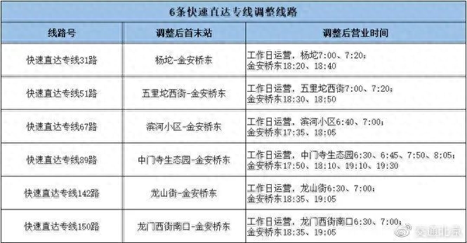 途经地铁苹果园站的6条快速直达专线,由地铁苹果园站缩短至金安桥东站上下客,调整后的运营时间见下表。