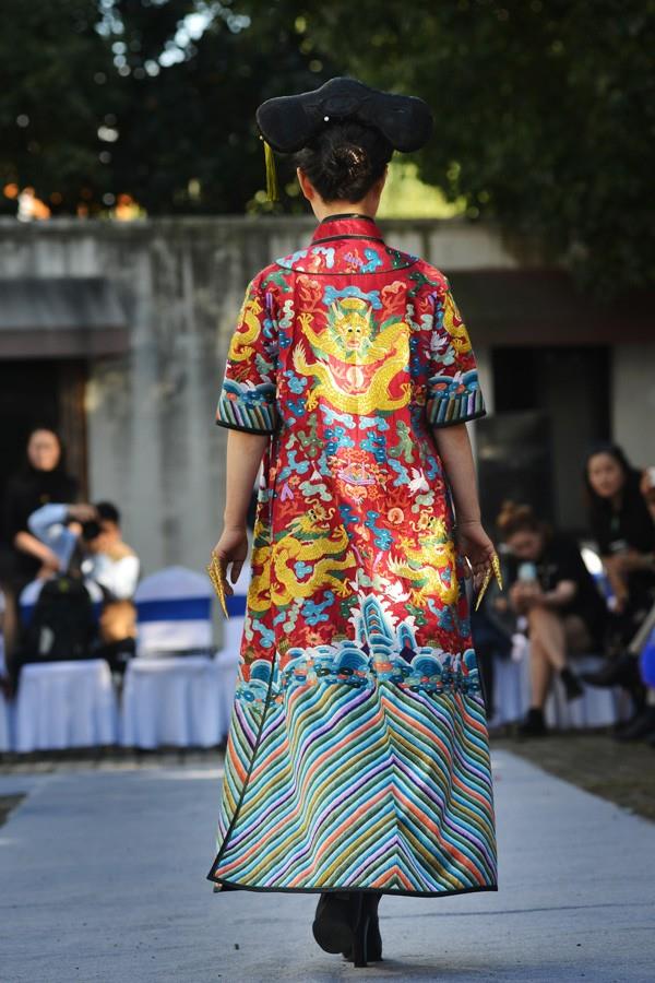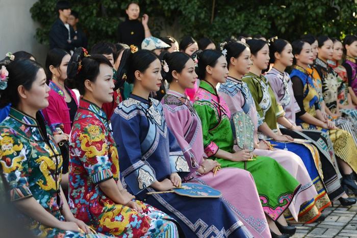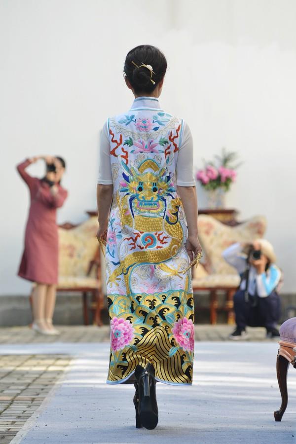 当天旗袍模特走秀的作品时间跨越长达100多年,从晚清到近代,每一件旗袍作品都让设计人宁市旗袍协会会长王微波费尽了心,她都亲自策划并参与制作,和她的团队一起对不同时期的旗袍进行了改进,让其更适合现代人的审美需求。每一件展示出来的旗袍她都从面料款式上进行把关,使其符合各个时代的特点。比如晚清时代的旗袍,结合当时北京旗人的着装,进行构思,研究那清末民初京派文化旗袍的特点。