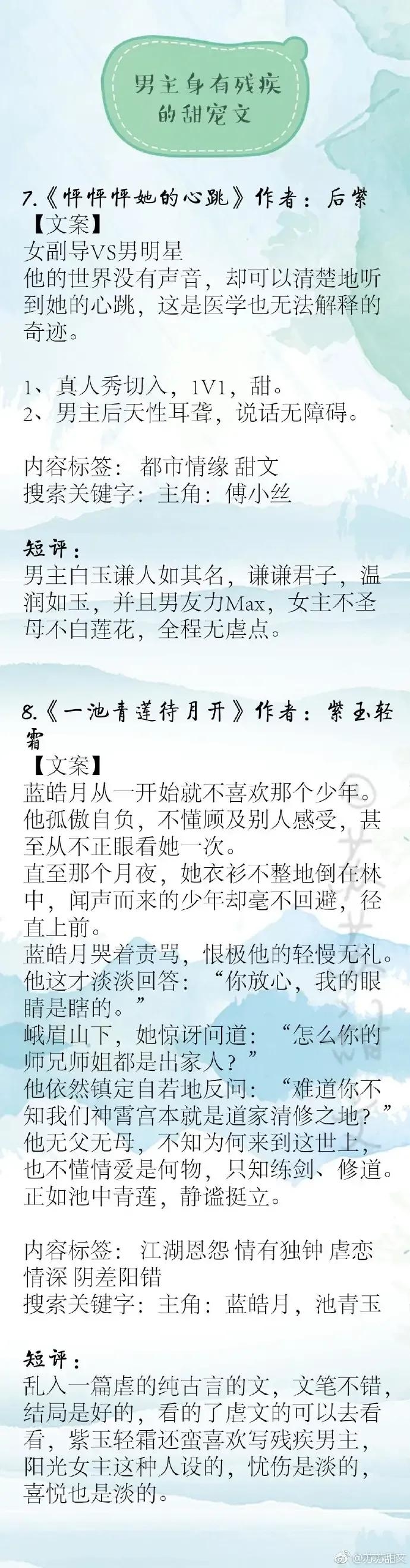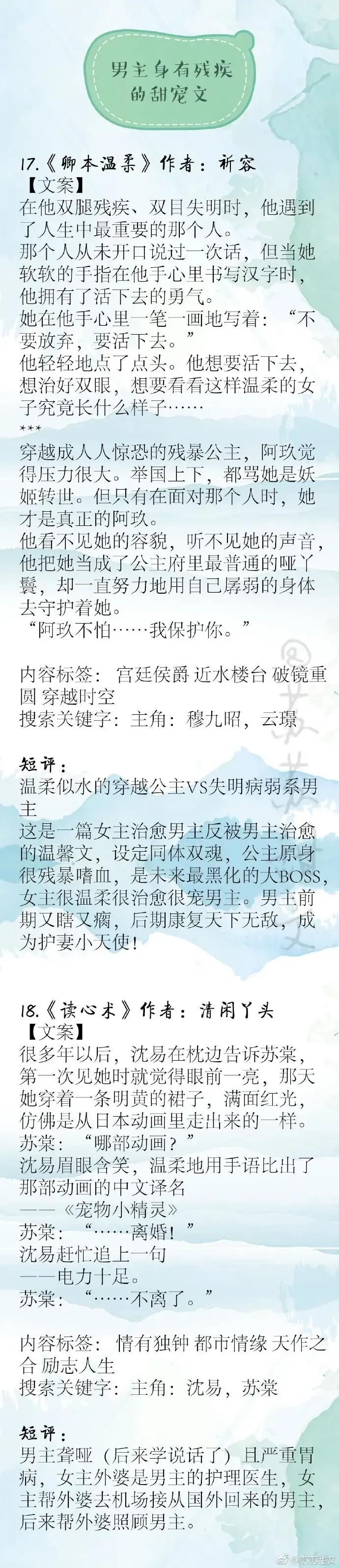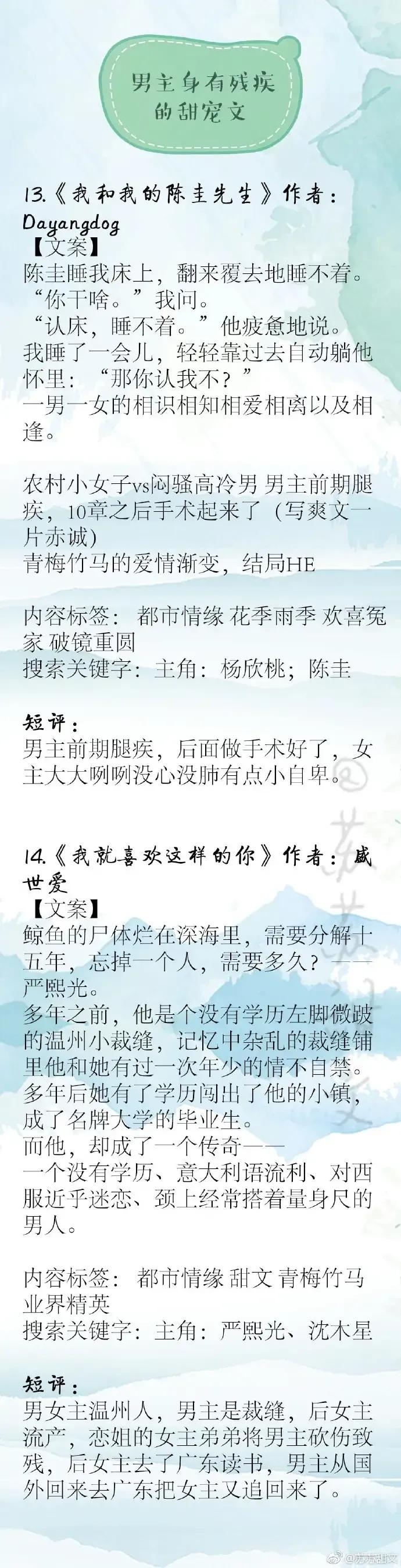 今天,给大家分享一大波男主身有残疾的精彩小说,虽然他们身有残疾,但你根本抵挡不住男主的魅力啊!又甜又暖又治愈。