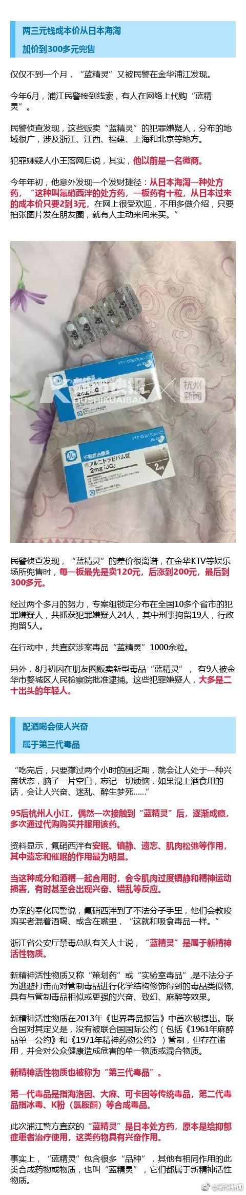 5月,浙江奉化公安首次查获货毒品氟硝西泮,又称“蓝精灵”。大多从日本海淘,淡蓝色、溶于水。如果把它放进饮料或酒里,不易被察觉。其带有明显的遗忘和催眠作用,常规尿检检测不出。这种第三代毒品的危害是第一代的1000倍。