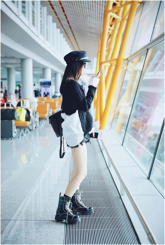 原以为秦岚穿的是一件相对从简大气的V领毛衣,想不到一回身这么亮眼,毛衣破洞拼接上白色衬衣的造型有点让人看不太懂,但是是非配的色差或是挺大气的,不得不说,富察皇后秦岚这回可谓是扩大招了,机场私服时兴到不可,脚上穿戴一双短皮靴加上了白色条纹的粉饰也很洋气,颀长的美腿真的是太吸睛了。