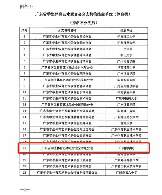 日期,广东省学生体育艺术联合会发布《关于公布广东省学生体育艺术联合会分支机构挂靠单位遴选结果的通知》(粤学体艺联〔2022〕31号)文件中,公布广州商学院获批成为广东省体育艺术联合会空手道分会挂靠单位。这是广东省学生体育艺术联合会对广州商学院体育工作的高度认可。