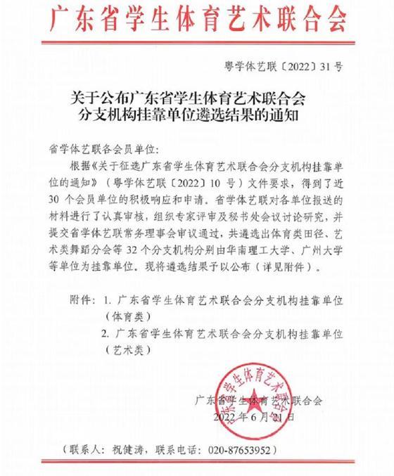 广东省学生体育艺术联合会(以下简称省学体艺联)受广东省教育厅委托,组织举办全省性学生年度体育赛事、学生艺术比赛、活动,开展学校体育、艺术教育研究和学术交流等相关工作。此次挂靠单位的遴选,经过学校申报、省学体艺联组织专家评审、省学体艺联合会常务理事会审议通过,32个分支机构入围挂靠单位名单。