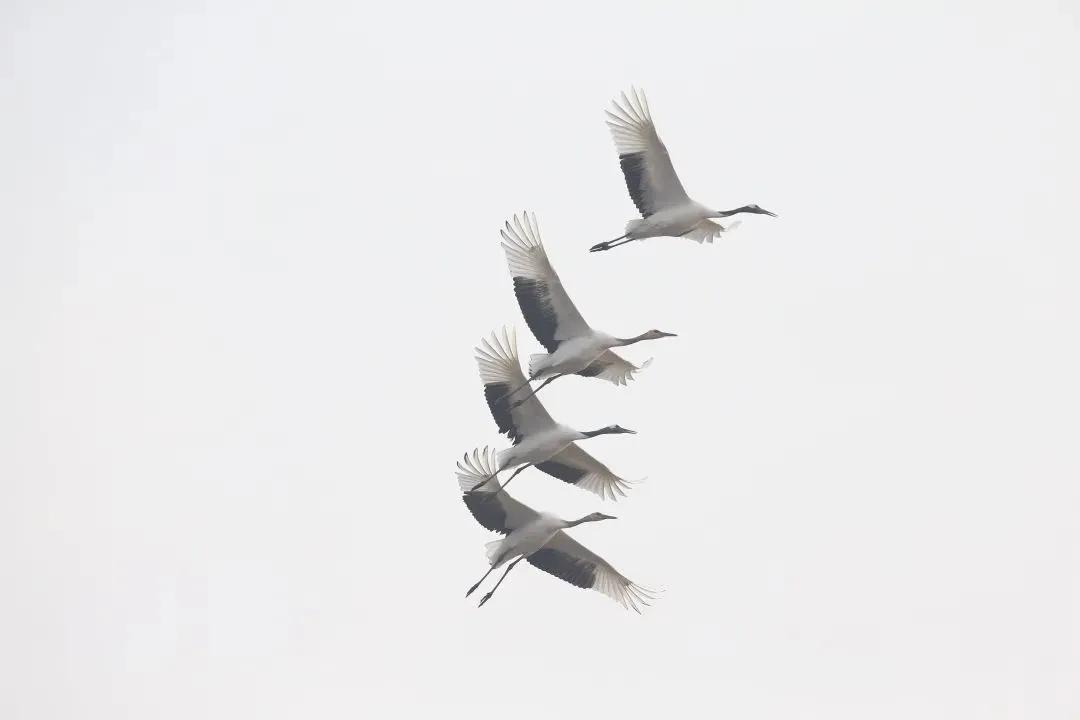 丹顶鹤体长约160厘米,翼展240厘米,全身几纯白色,头顶呈朱红色,站立时尾部黑色,雌雄相似,是易危级、国家一级保护动物。2010年,预估总数仅有1500只左右,其中在中国境内越冬的有1000只左右。