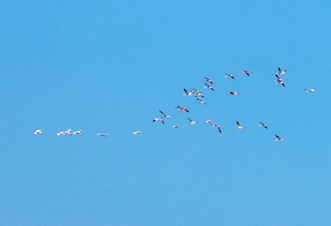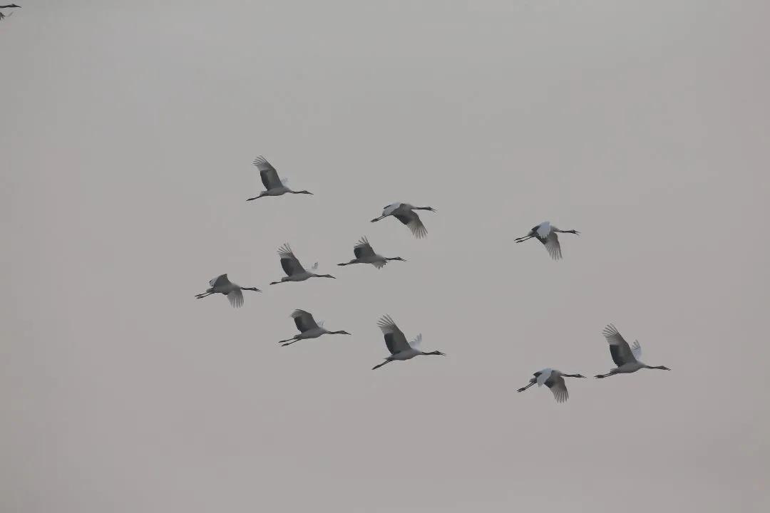 11月6日,32只丹顶鹤落地鸽子窝湿地,这样大的种群落地是近十余年来首次出现。据任鸟飞项目专职调查员胡晓燕大姐介绍,在昨天晚上她离开鸽子窝湿地时还没有出现丹顶鹤,今天一早,来到湿地时,就发现有六小群,共32只丹顶鹤在海岸线栖息觅食,直至上午十点多才离开,她记录下了丹顶鹤在鸽子窝湿地的影像。鹤群的一起一落,在空中飞翔的样子让人心驰神往。当天共有46只丹顶鹤在秦皇岛迁徙过境。