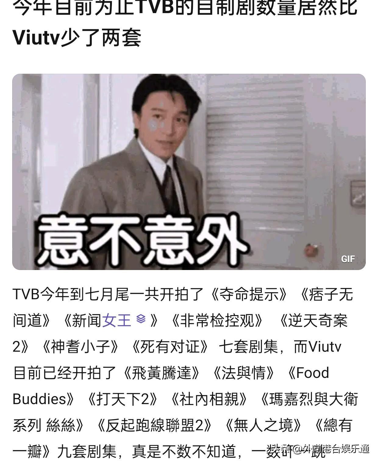该帖作者表示,自2023年以来,TVB仅拍摄了《夺命提示》、《痞子无间道》、《非常检控观》、《神耆小子》、《死有对证》等7部剧集,反倒是ViuTV一口气拍摄了9部,真是“不数不知道,一数吓一跳”。