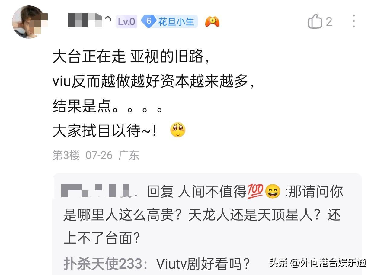 “大台正在走亚视的老路,Viu反而越做越好,资本越来越多,结果怎样,我们拭目以待。”一位ViuTV粉丝兴奋的留言称。另一位顶着11级粉丝标识的ViuTV粉丝表示,这就是北进策略的下场,越来越low。