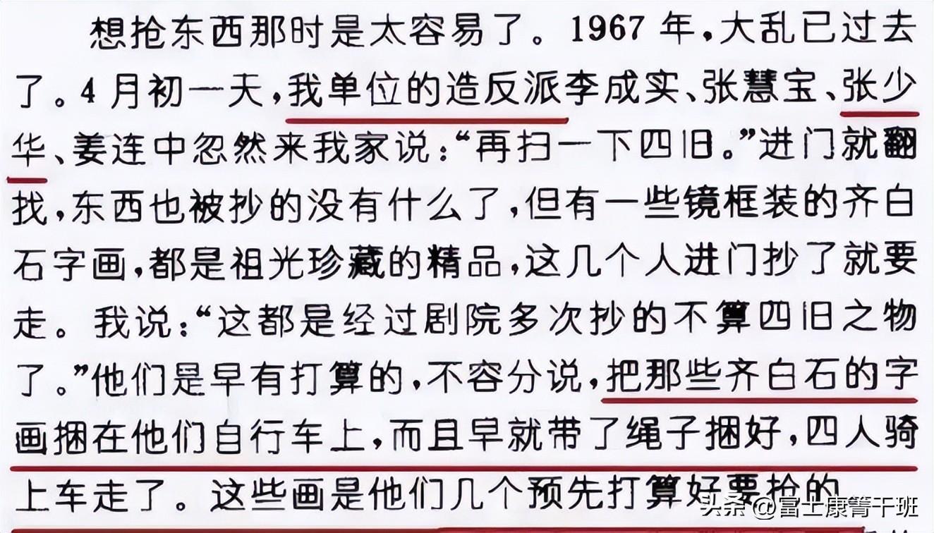 我单位的造反派李成实,张慧宝,张少华,姜连中忽然来我就说:再扫一下四旧!…………那些齐白石的画,困在他们的自行车上,而且是早有准备带了绳子,四人骑车走了,这些画是他们几个预先就打算要抢的。