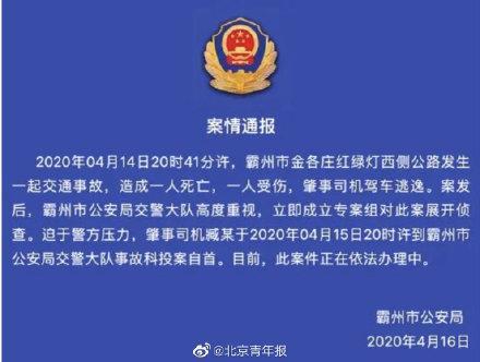 4月16日,霸州市公安局通报称,4月14日20时41分许,霸州市金各庄红绿灯西侧公路发生一起交通事故,造成两名女性一人死亡,一人受伤,肇事司机驾车逃逸。