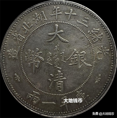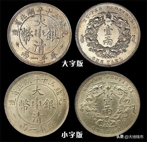 币面正中央铭文“大清银币”,上为“光绪三十年湖北省造”,下方刻“库平一两”,背面为“双龙戏珠”,上下英文。根据“大清银币”4个字的大小,可以分为大字版和小字版。
