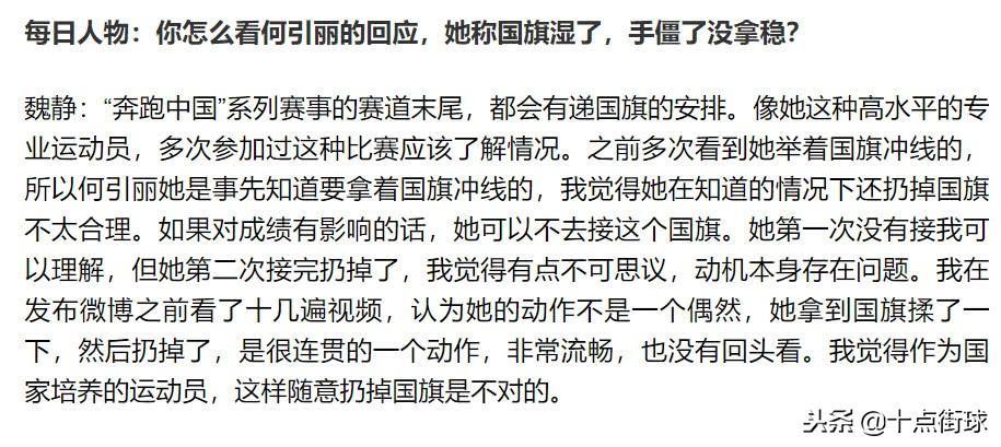 对于何引丽赛后声称的“国旗湿、手僵没拿稳”的说法,魏静直言:“奔跑中国”的赛事都会有递国旗的安排,作为资深、高水平的专业运动员何引丽,怎么可能不了解这样的情况;况且之前的很多比赛,何引丽都是在最后时刻拿着国旗冲线的,所以她是知道会有递国旗的安排,那么知道的情况下还仍国旗,就不太合理了,要么你不接(国旗),如果接了就不要扔,这让我感受到不可思议。而且我看了那个视频十几遍,她的动作不是偶然,先是揉成一团、再扔掉,非常流畅,我觉得国家培养出来的运动员,这样的行为是不对的!