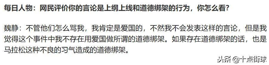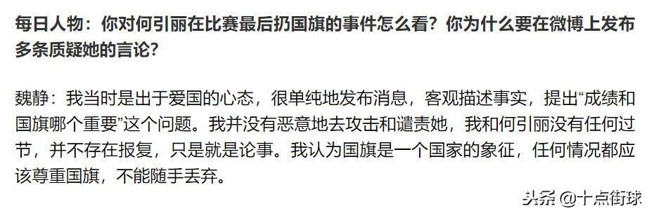 随后,大众舆论的焦点瞄准了同为运动员的魏静,她在经历了狂风暴雨的一天后,接受了《每日人物》的专访,对自己的言论和外界的抨击进行的解释