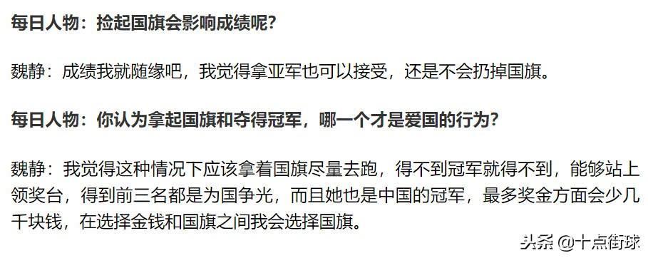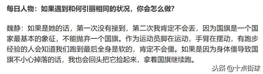 《每日人物》:捡起跑影响成绩怎么办?夺冠和国旗在你心中哪个更重要,哪一个才是爱国行为?魏静:成绩我就随缘,亚军我也能接受,也绝不扔掉国旗,我会拿着国旗尽量跑,得不到冠军就得不到,前三名站上领奖台也是为国争光,最多在奖金方面少几千块,所以在金钱和国旗之间,我会选择国旗