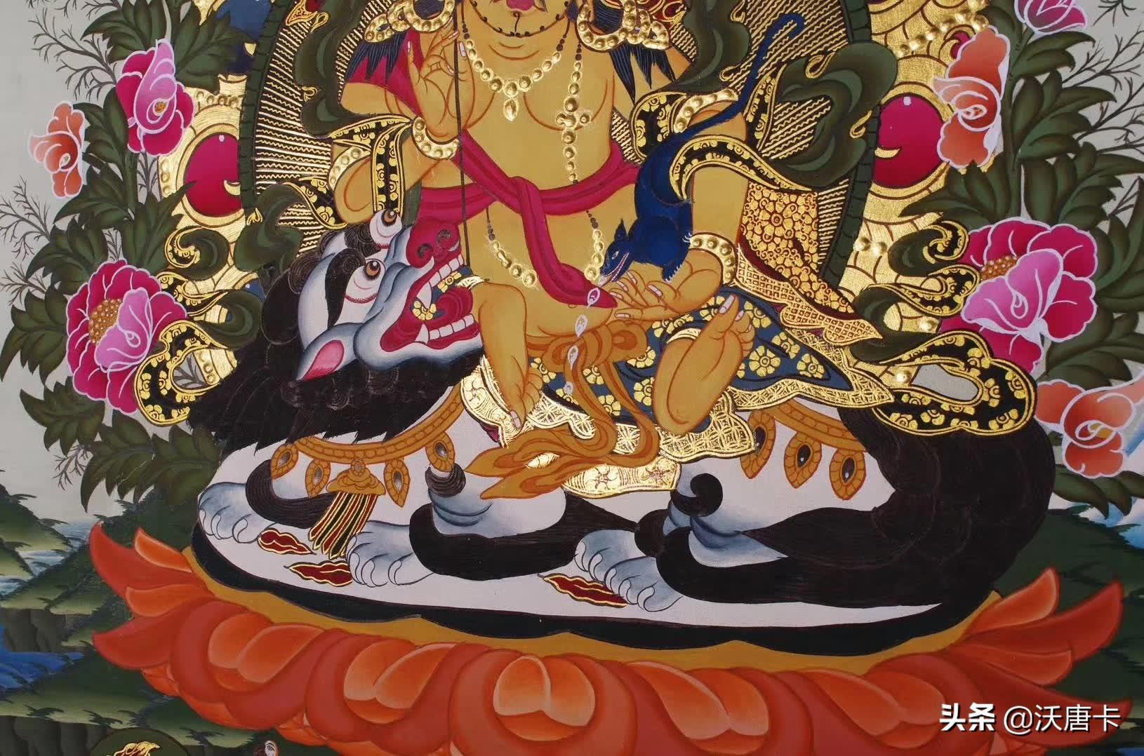 多闻天王,身据北俱芦洲,身着七宝庄严甲胄,有佩刀,左手上卧有一只神鼠,右手持伞或幡,一方面能够引导世人从善,一方面能用武力喝退邪魔,尊身为绿色,以恩赐众生福德而闻名受尊。多闻天王还有一个身份就是古印度的财神,施财天。