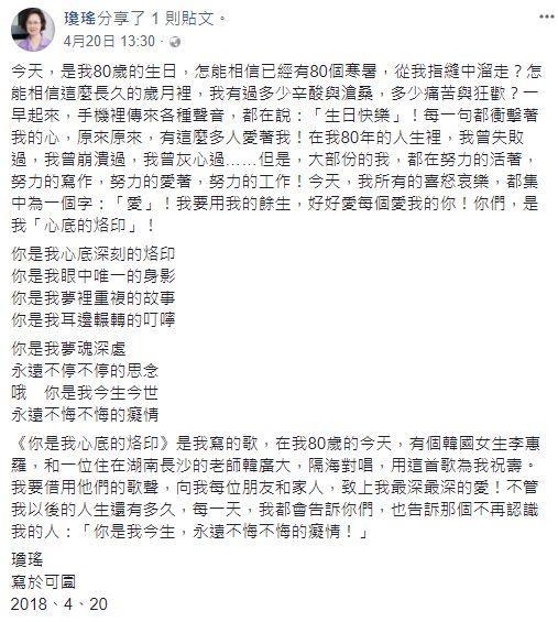 林婉珍的新书震惊了娱乐圈,很多媒体对此也是纷纷报道,而作为书中当事人之一的琼瑶,在沉默了一天之后,终于在脸上上发文做了回应。