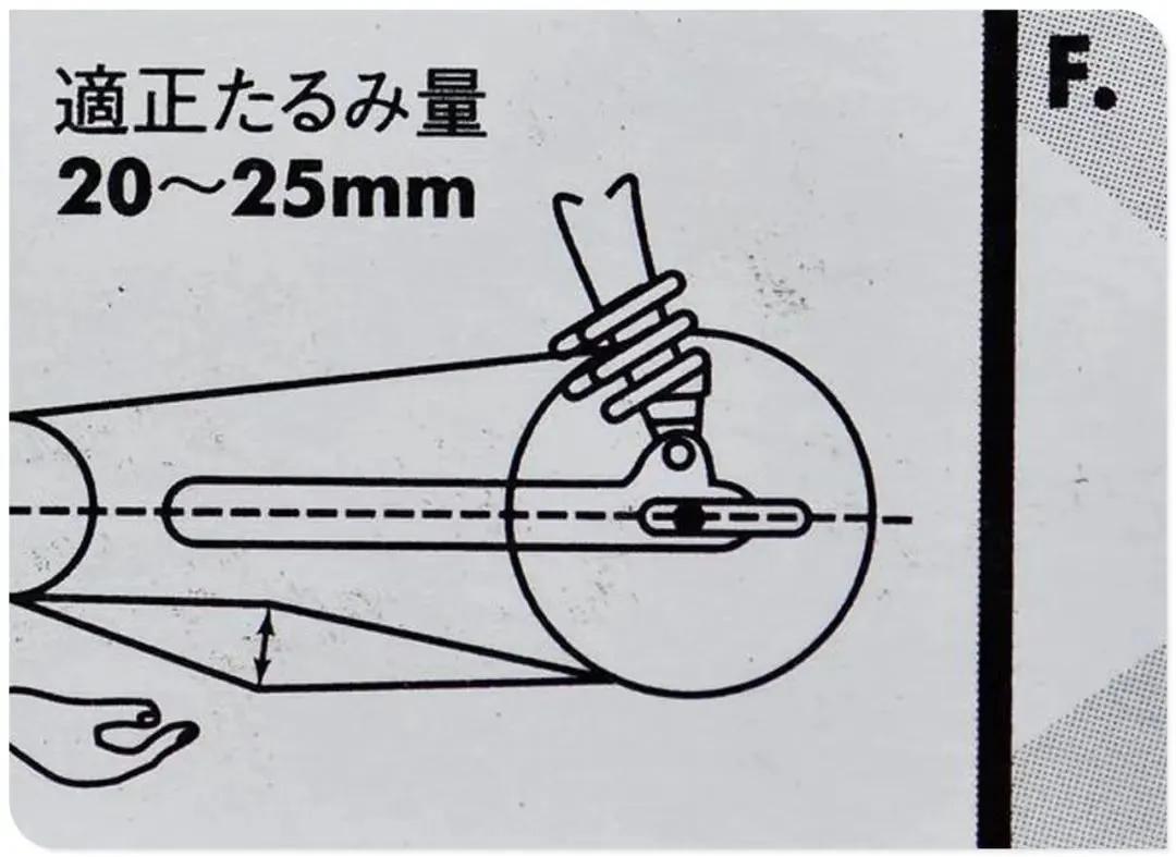 根据链条包装盒上的图例,链条调整需要将前后齿盘放置于同一水平面上并测量中央的上下摆幅约为 20~25mm。同时也要配合车辆说明综合确定链条松紧幅度。