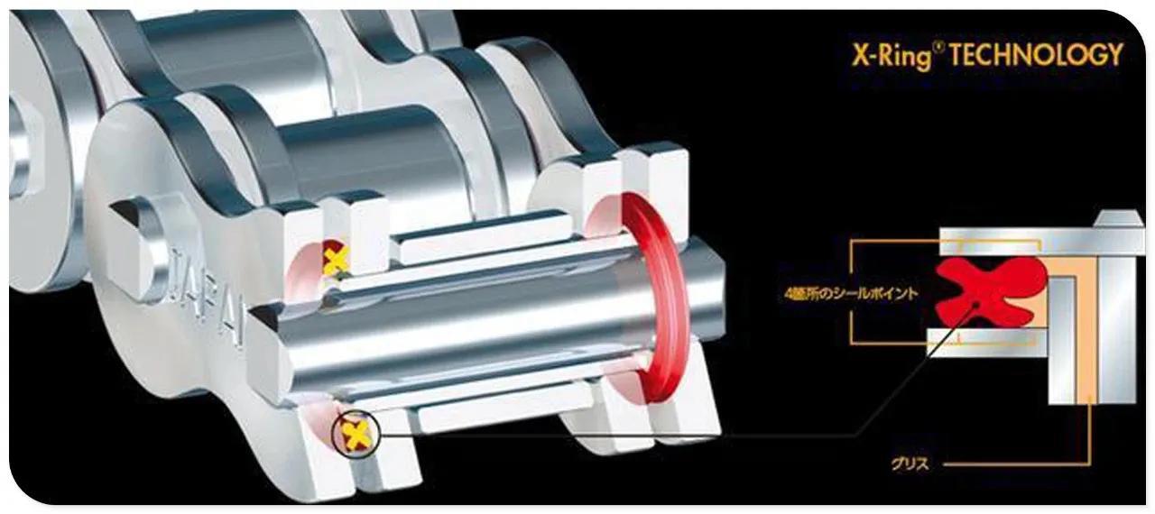 X-ring 一共有四个接点和内外链片接触,内层负责挡住销与衬套之间的润滑油,外层负责挡住外面来的泥沙和雨水。