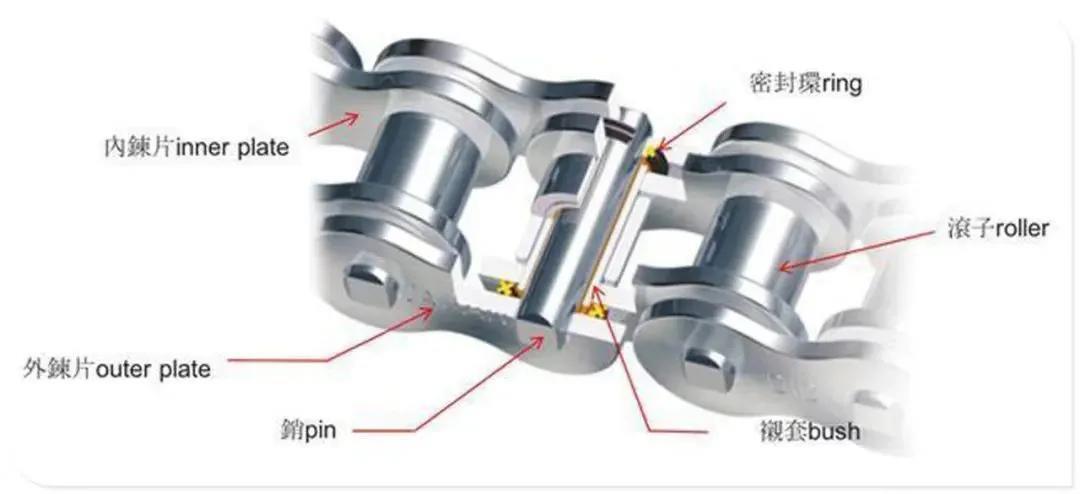 以油封链来看, 大概可以分为内链片、外链片、销、衬套、滚子、油封等六大结构。
