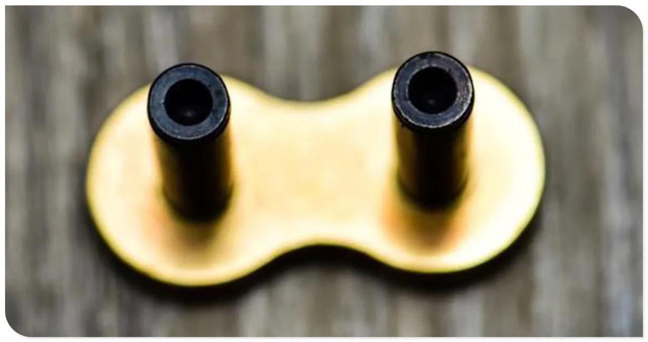 在链条的制造上,销与衬套的精度与耐磨耗性是相当重要的一环。通常我们说的链条被拉长,主因都来自于销与衬套的磨损。可别小看这一点点的差距,以一条 100 节的链条来说,只要每一节被拉长 0.1mm,100 节加起来就变长一公分了。而且当链条开始产生磨耗了,磨耗速度就会急速变快,所以要特别小心。