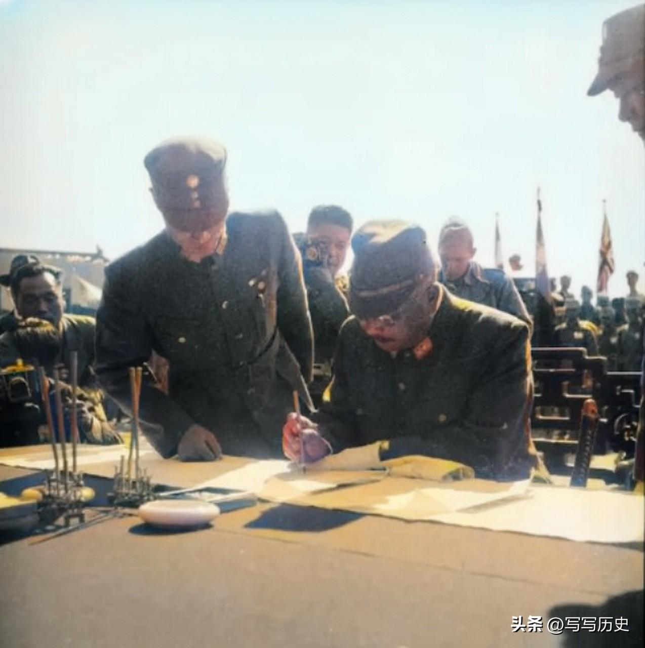1945年9月2日,在东京湾上的美国密苏里号战列舰上,日本外相重光葵和日军参谋总长梅津美治郎分别代表日本政府和日军大本营在投降书上签字。