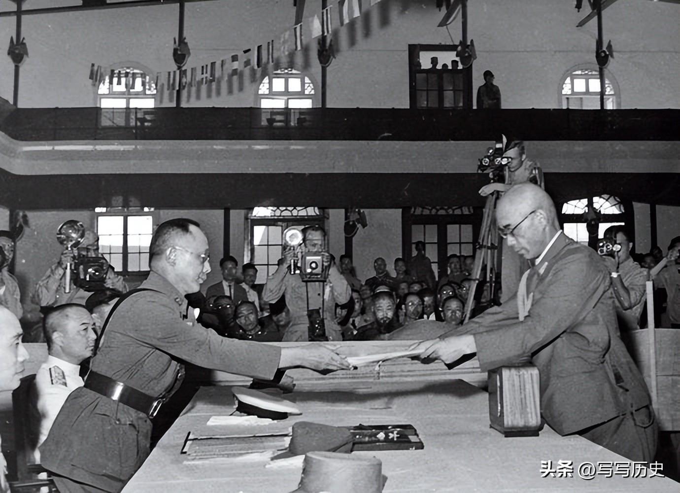 1945年9月9日,中国战区投降仪式在南京举行,中国派遣军总司令冈村宁次在投降书上签字。