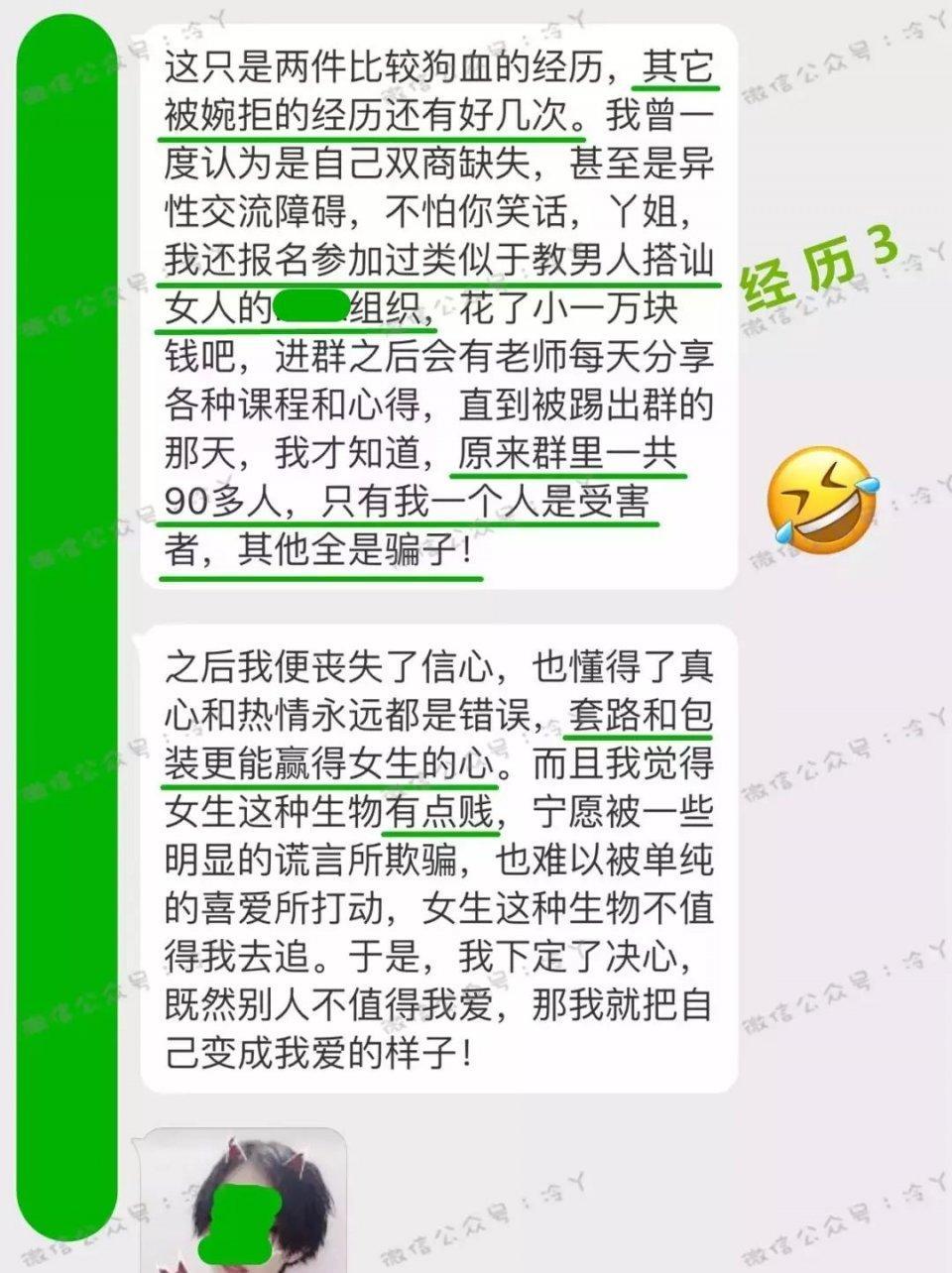 看到这我忍不住想插嘴了,小哥哥的经历也太悲惨了吧,被两个暗恋对象轮流戴绿帽?!当然,肯定会有人说,没有确定关系,你俩也不是情侣,谈不上“戴绿帽”这一说。不过,小哥哥当时内心的痛苦,我无法将心比心,只能说舔狗不易吧。而且,他居然还花钱去学习?小一百人群里就他自己是受害者?其他全是骗子?对不起我想笑。