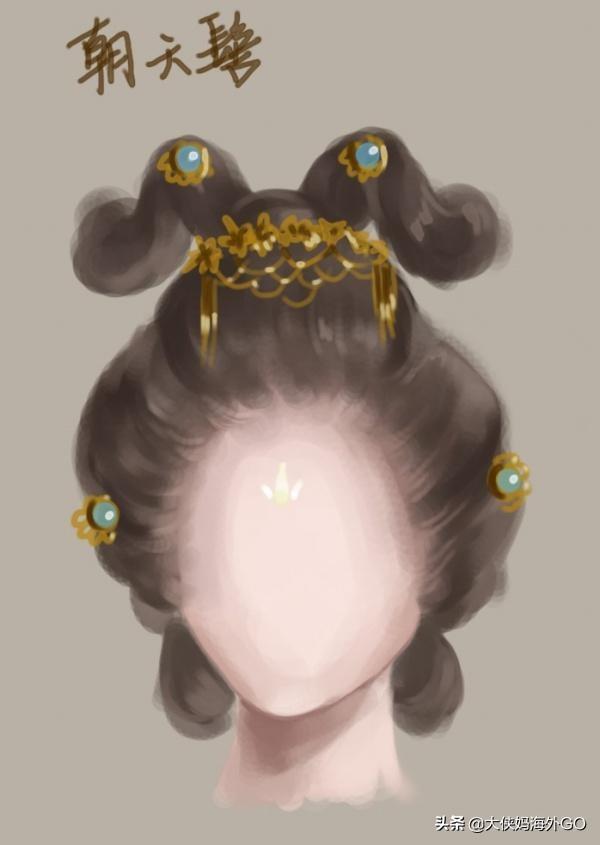 属于交拧的形式,其髻交集拧旋,悬空托在顶上。据《中华古今注》记载:“隋有凌虚髻、祥云髻。”这种发式如云盘回,凌托顶上,摇而不脱落。