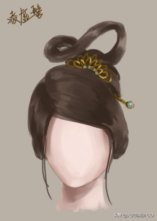 属于高式的单鬟。据《中华古今注》记载:“始皇诏后梳凌云髻,三妃梳望仙九鬟髻,九嫔梳参鸾髻。”这些皆属高鬟式。