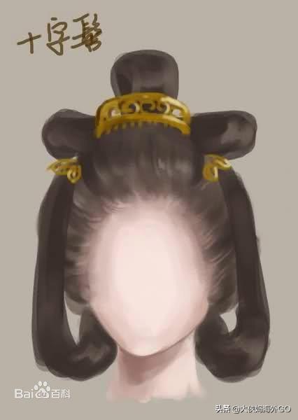 因其发髻呈“十”字形而得名的一种髻式。这种发式的编盘方法是:先将头发盘成一个“十”字行的发髻,再将余发在头的两侧各盘一鬟直垂至肩,上用簪、钗固定即可。流行于魏晋南北朝时期,最为形象的图象资料如西安草厂坡出土的北魏彩绘陶俑,梳的就是这种发髻。魏晋之后各朝均很少见。