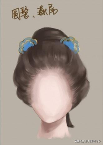 清中期盛行发饰,把头后面的耳边的垂发,梳成扁平状,末端用发带束起,微微上翘,形似燕尾。整个发髻象个待飞的燕。