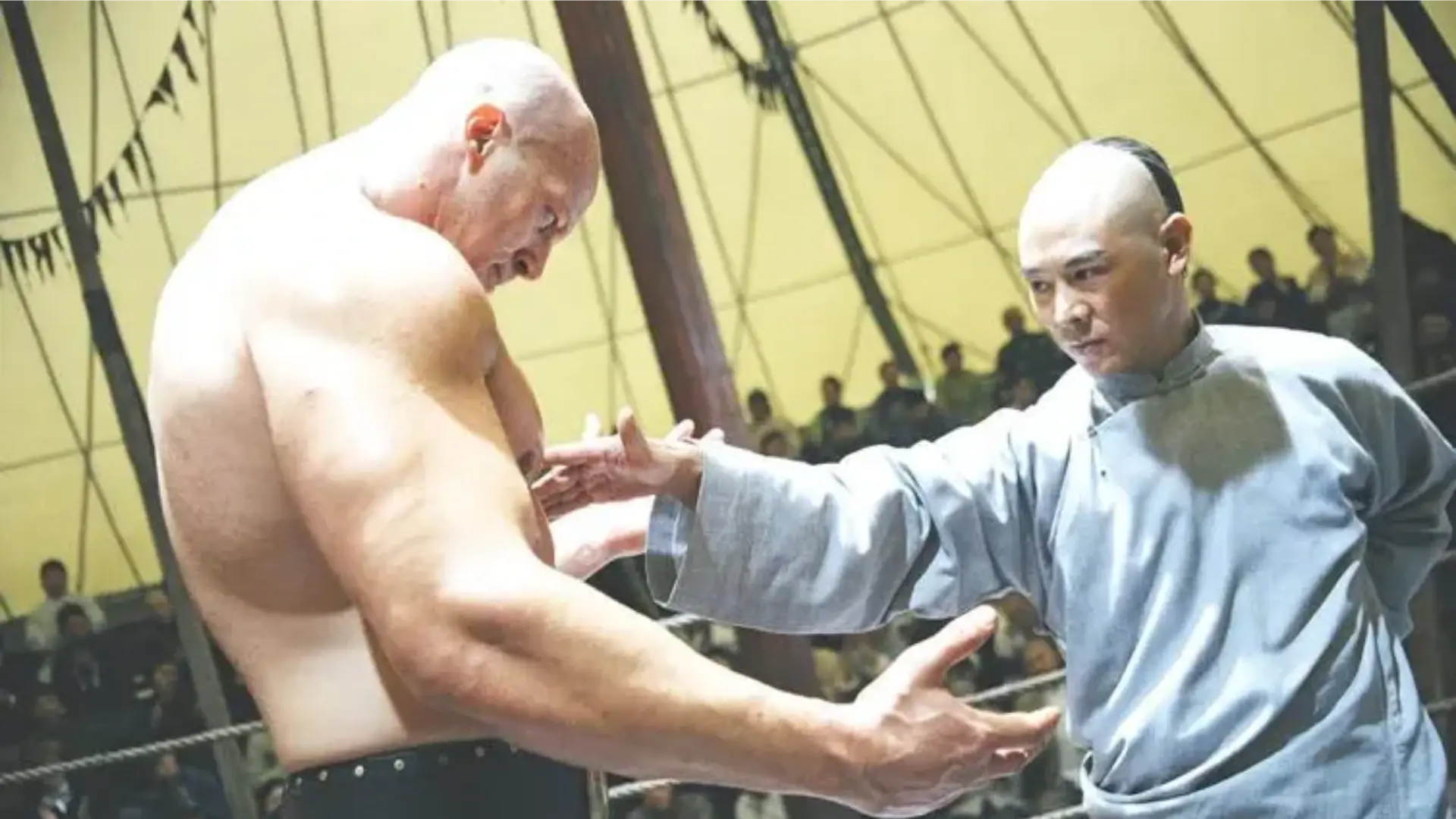 可霍元甲等了很长时间,英国那个嚣张跋扈的大力士迟迟没有到来,直到来了个洋人说道:“我方选手今天身体不适,比赛暂时搁置!”后我们才知道,这个大力士也没啥真本事,听说霍元甲应战后早就逃之夭夭了!