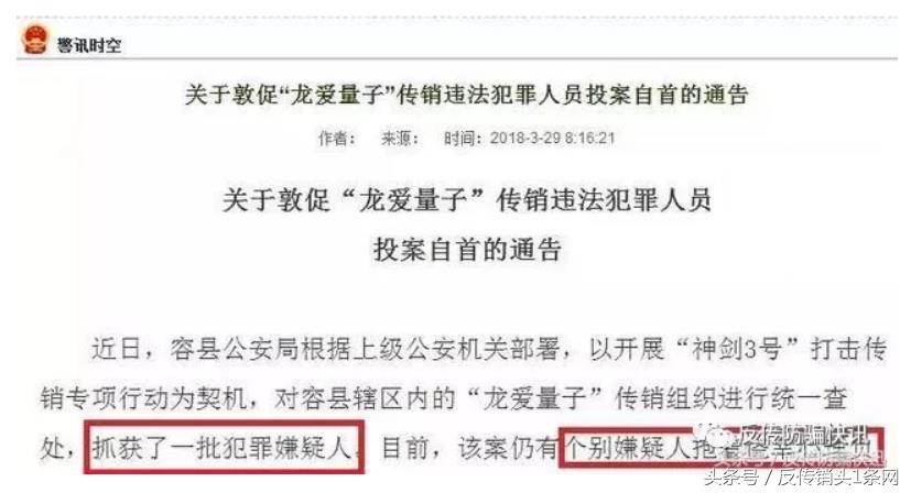 2018年3月31日,反传防骗快讯从容县公安局了解到,近日,该局在3月29日发布通告敦促“龙爱量子”传销违法犯罪人员投案自首。该通告称,容县公安局根据上级公安机关部署,对容县辖区内的“龙爱量子”传销组织进行统一查处,抓获了一批犯罪嫌疑人。